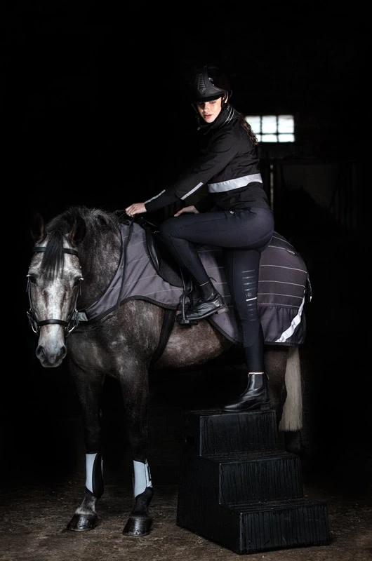 Die Reitdecke Amigo Reflectech Comp Sheet hat einen eingenähten Reflektor an den Seiten sowie vorne und hinten. Die Reitdecke hat Klettverschlüsse am Widerrist und vorne. Perfekte Reitdecke für unterwegs, wenn es draußen dunkel und kalt ist.