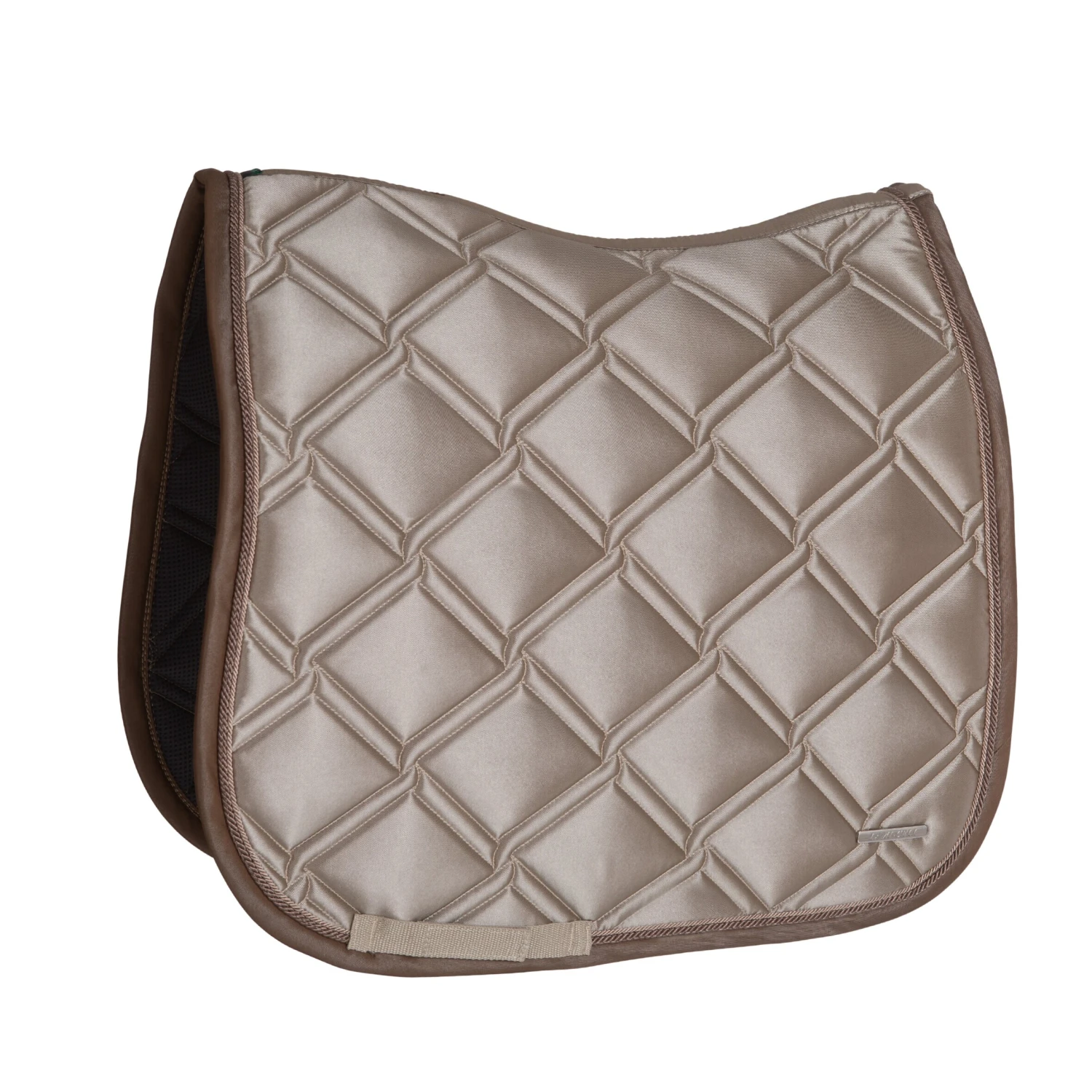 Die Dressurschabracke Aurora ist in einem sehr stilvollen und eleganten Modell hergestellt. Die Schabracke ist mit einem glänzenden, schmutzabweisenden, recycelten Eco Green-Polyester gesteppt, das aus recycelten PET-Flaschen hergestellt wird.