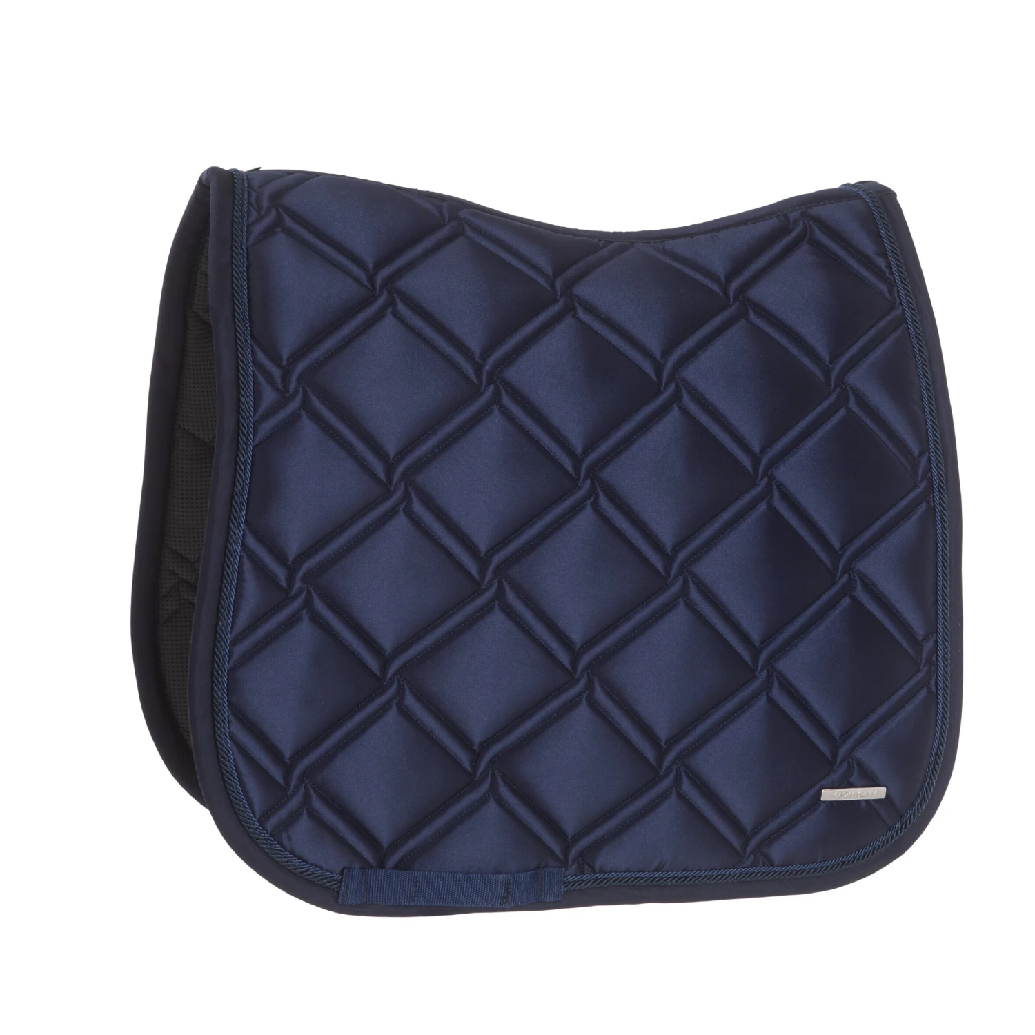 Die Dressurschabracke Aurora ist in einem sehr stilvollen und eleganten Modell hergestellt. Die Schabracke ist mit einem glänzenden, schmutzabweisenden, recycelten Eco Green-Polyester gesteppt, das aus recycelten PET-Flaschen hergestellt wird.