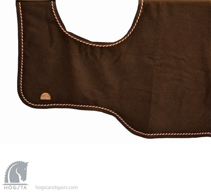 Schöne Ausreitdecke für Ihr Pferd von Mias RS in Braun mit einer Kordel in Braun/Cremeweiß/Kupfer. Die Ausreitdecke besteht aus schwerer Wolle, was sie sehr stabil und wärmend macht. Wie alle Produkte von Mias RS hat diese Ausreitdecke eine sehr gute Passform und Qualität. Die Ausreitdecke wird vor dem Sattel zugeknöpft und kann unter das Sattelblatt oder über die Beine des Reiters gelegt werden. Perfekt, um den Rücken des Pferdes während Abreitens, Trockenreitens oder während des Ausritts an kühleren Tagen warm zu halten