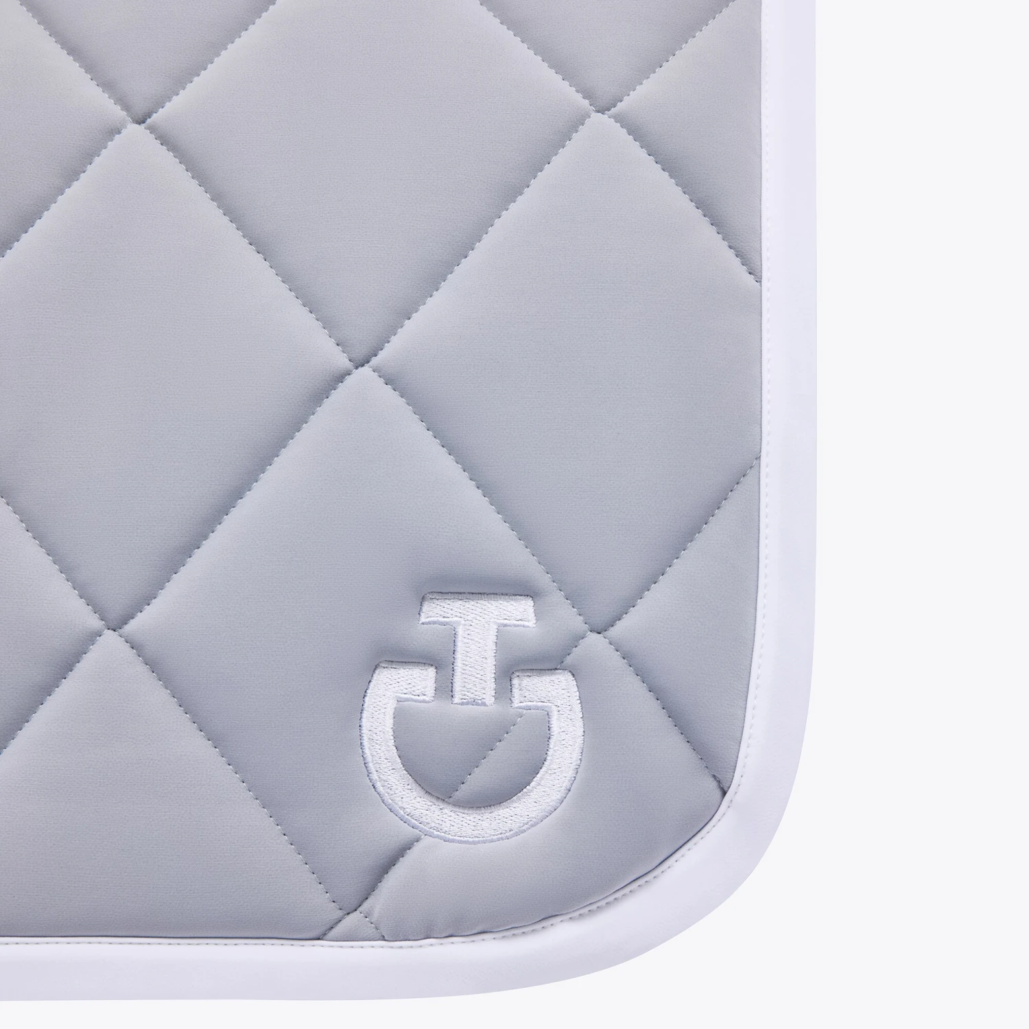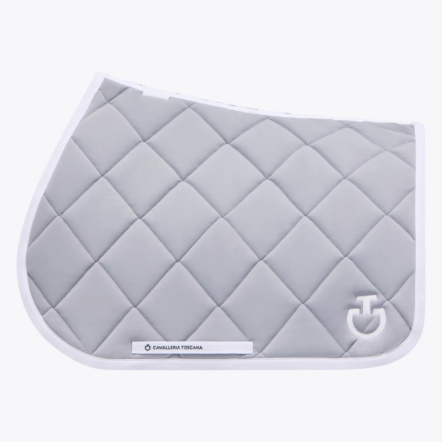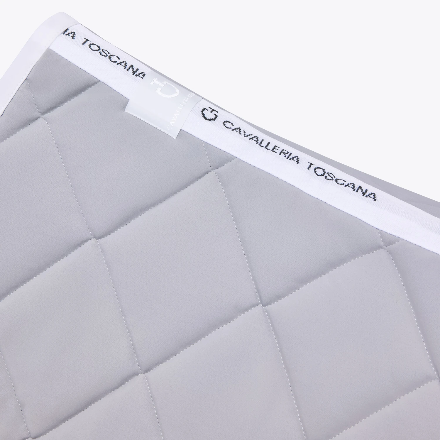 Diese Springschabracke von Cavalleria Toscana ist stilvoll und elegant mit großen gesteppten Quadraten. Die Diamond Quilted Jersey Springschabracke hat eine schöne hellgraue Farbe mit weißen Details in Form von weißen Kanten, einem CT-Logo auf der linken Seite und einem weißen Kanal entlang des Rückens.