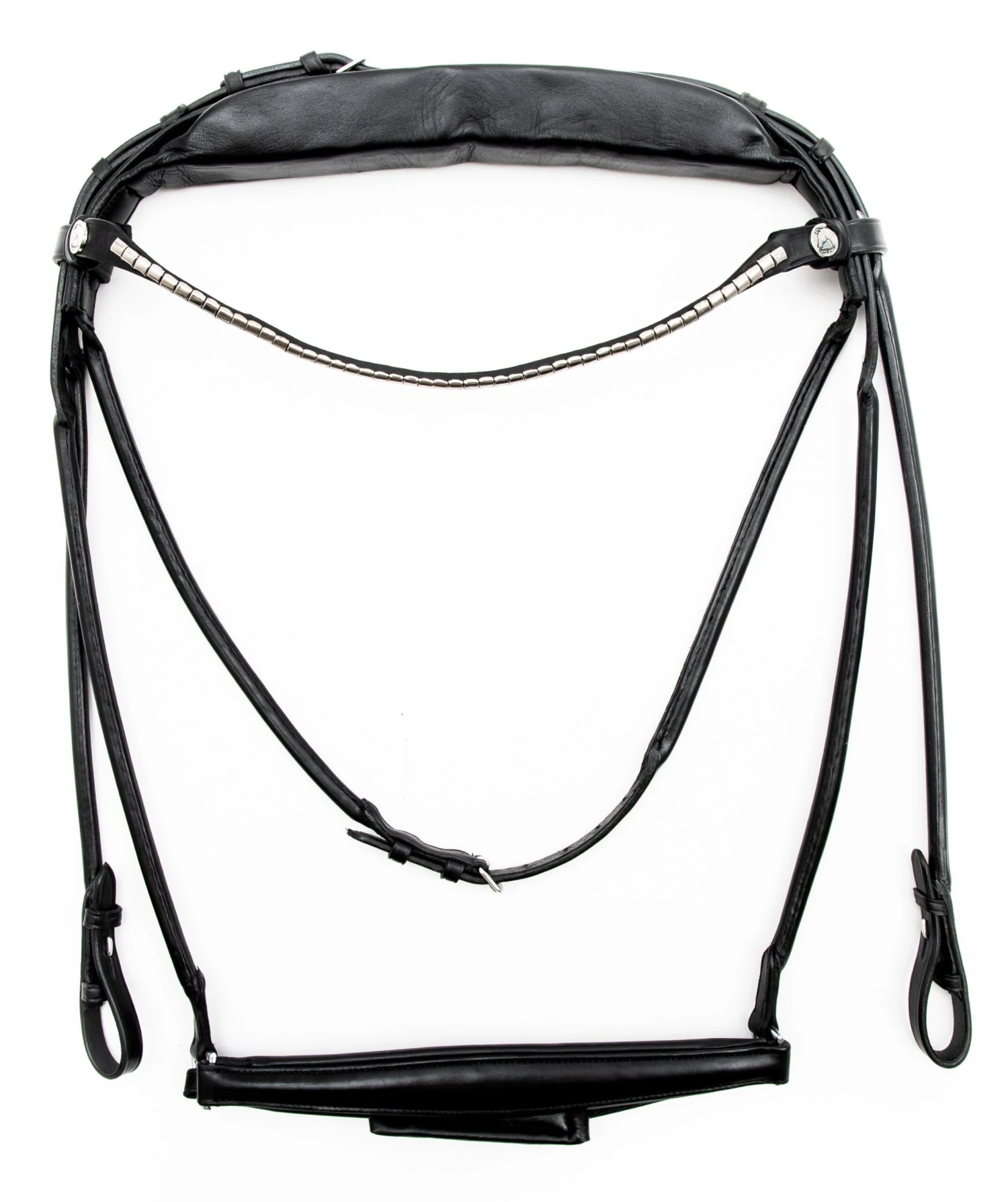 Ein anatomischer und rundgenähter Trensenzaum mit einem einzigartigen Genickstück, welches Druck- und Muskelschäden in den Hals- und Nackenmuskeln des Pferdes vorbeugt. Die Trense ist mit einem dünnen Stirnriemen mit schickem silbernem Klinker ausgestattet.