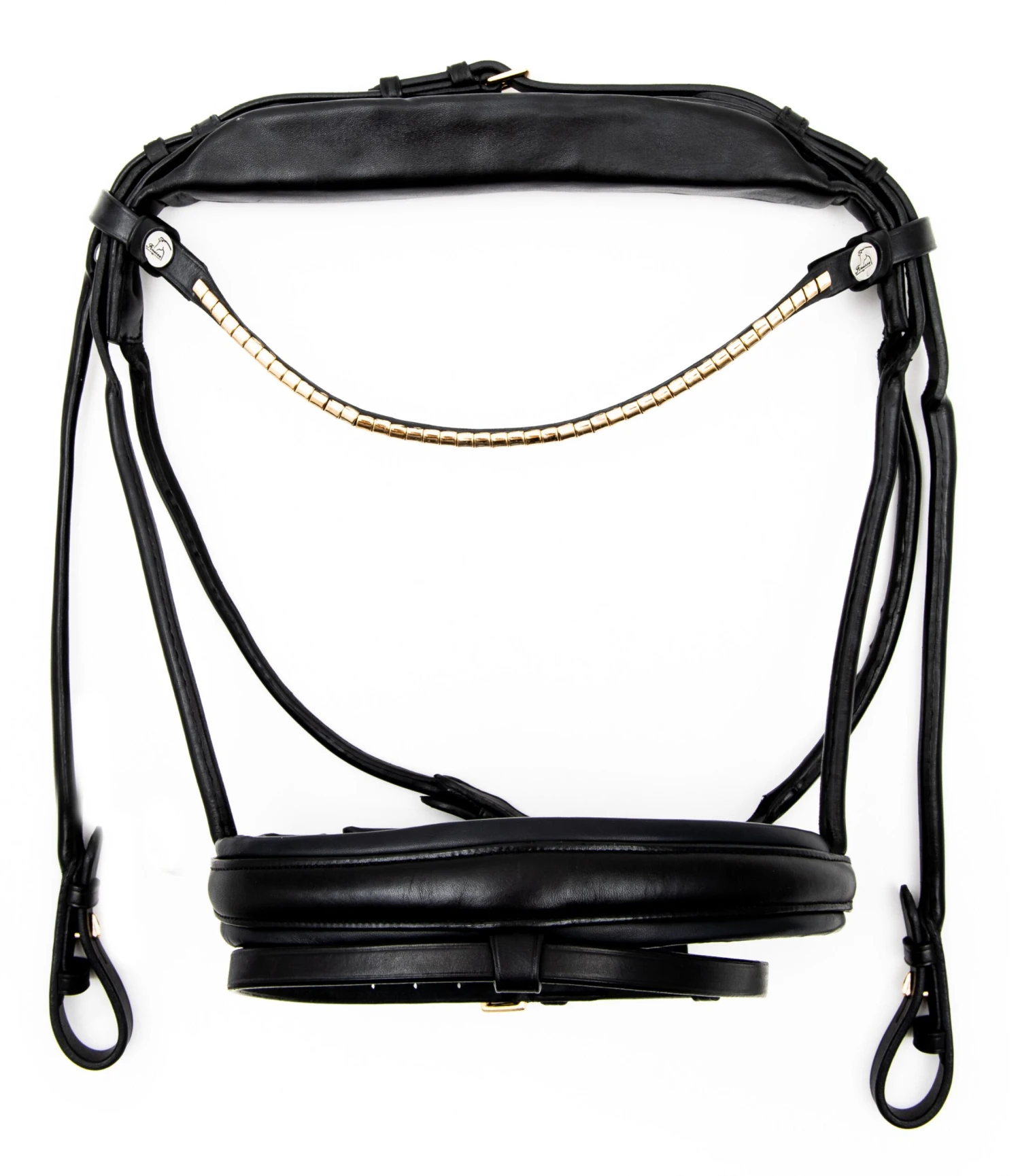Ein anatomisches und rundgenähtes Zaumzeug mit einem einzigartigen Genickstück, das Druck- und Muskelschäden in den Hals- und Nackenmuskeln des Pferdes vorbeugt. Das Zaumzeug ist mit einem dünnen Stirnband mit schicken Messingvierecken ausgestattet.