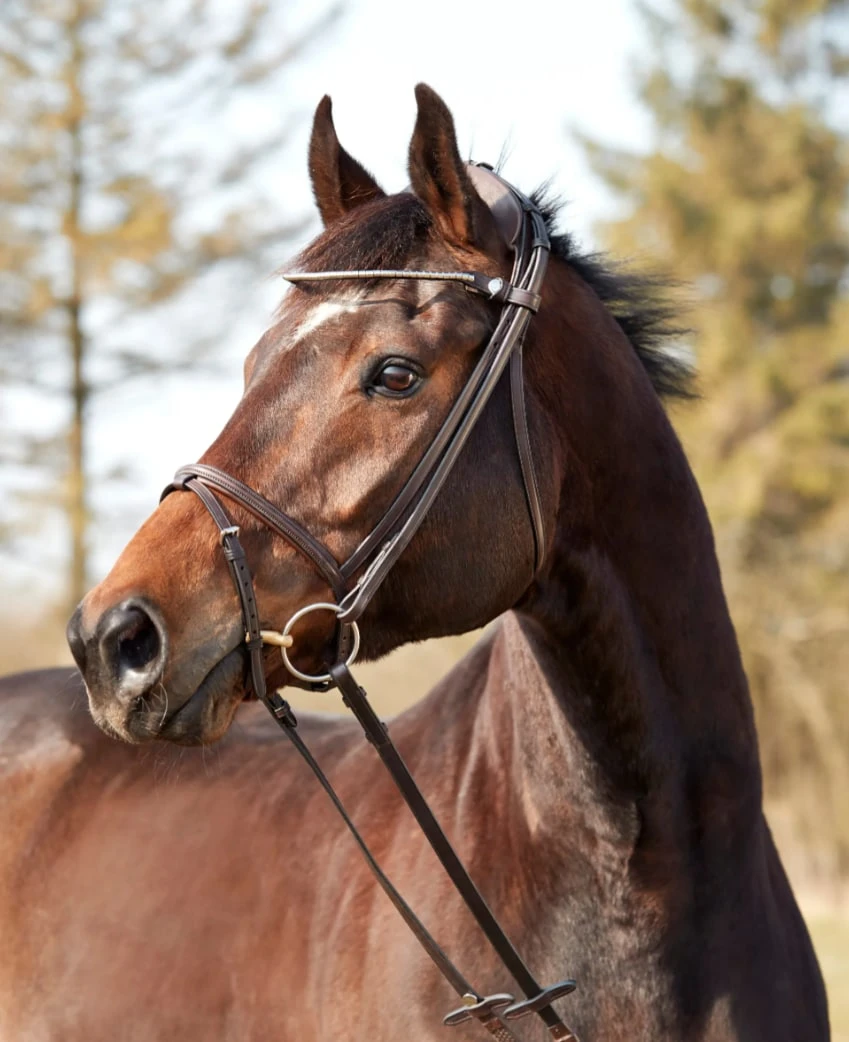 Finesse Bridle Zorro ist eine super elegante, schlichte Trense mit dem einzigartigen Genickstück, das den größten Unterschied zwischen einer normalen Trense und dem Finesse Bridle darstellt. Das Genickstück verhindert Druck- und Muskelschäden in der Hals- und Nackenmuskulatur des Pferdes. Die Trense ist mit einem dünnen Stirnband mit attraktivem Silberklinker ausgestattet. Der Nasenriemen der Trense Zorro ist sehr schmal und Ton in Ton gefüttert.