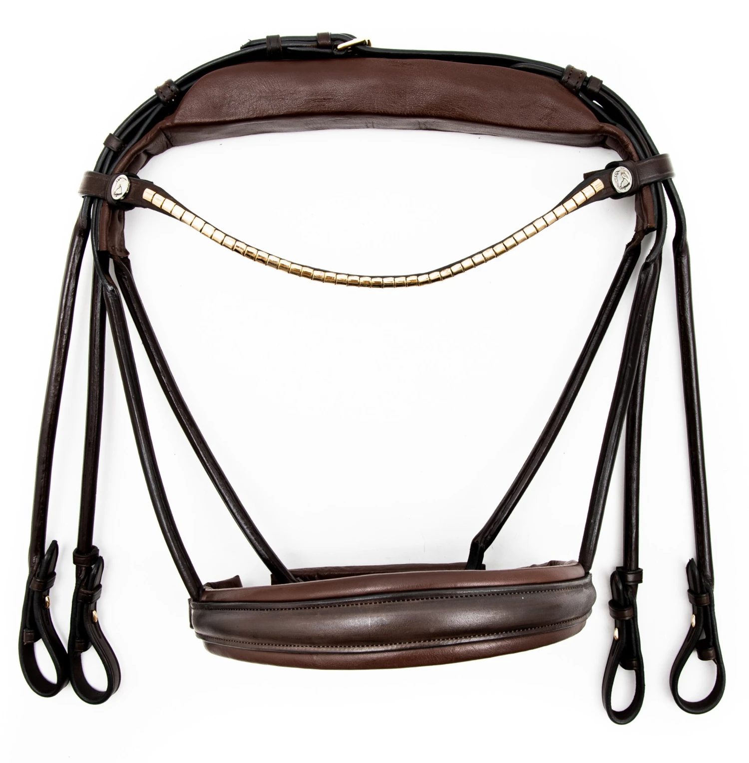 Finesse Bridle hat ein völlig anders ausgeformtes Genickstück als andere Zaumzeuge auf dem Markt. Das Genickstück dieser Trensen und Kandaren dient dazu, den Druck auf den Hals des Pferdes zu verteilen und zu reduzieren.