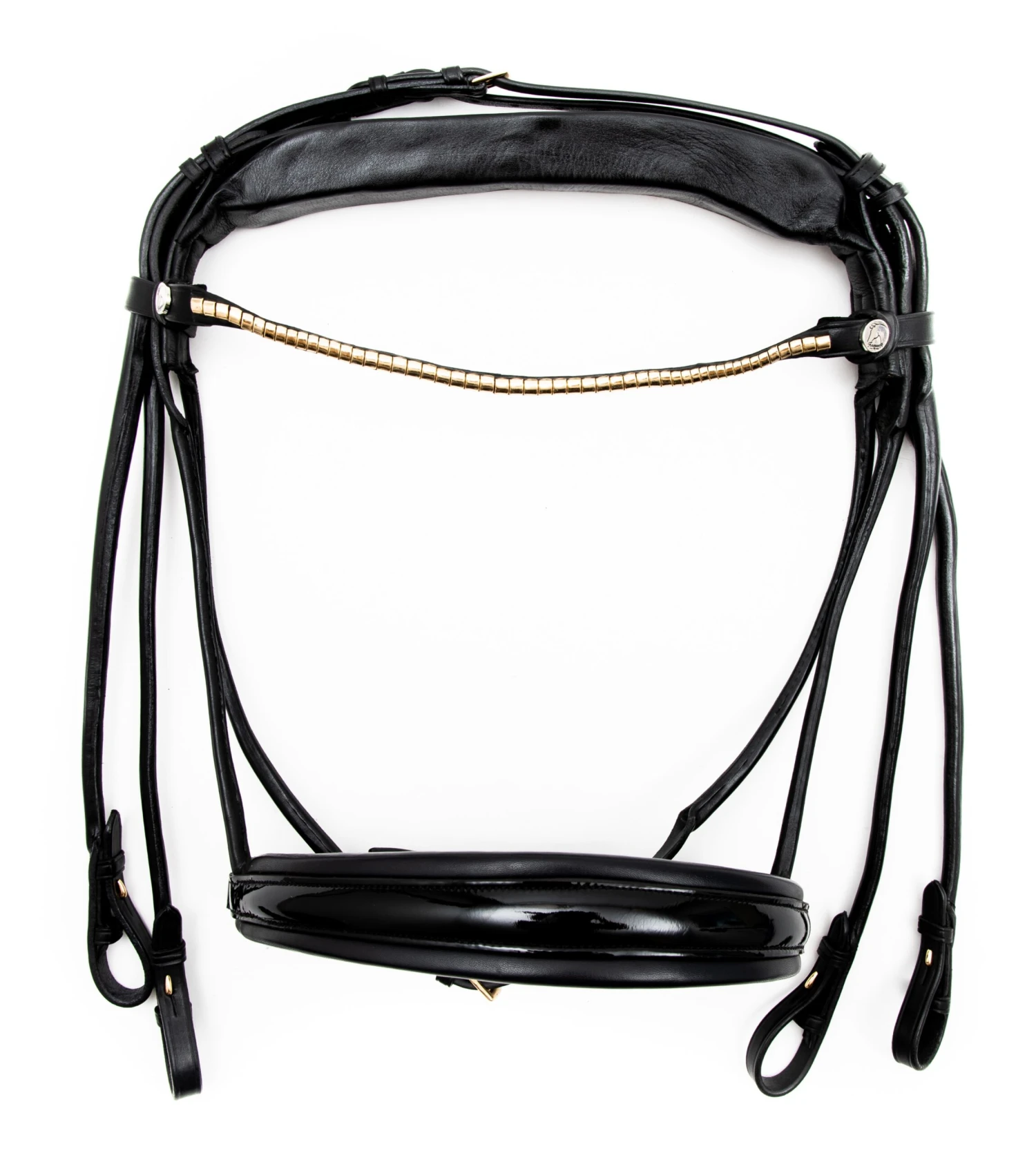 Ein anatomische und rundgenähte Kandare mit einem einzigartigen Genickstück, das Druck- und Muskelschäden in den Hals- und Nackenmuskeln des Pferdes vorbeugt. Die Kandare von Finesse Bridles ist mit einem dünnen Stirnband mit stilvollem Klinker in Silber ausgestattet