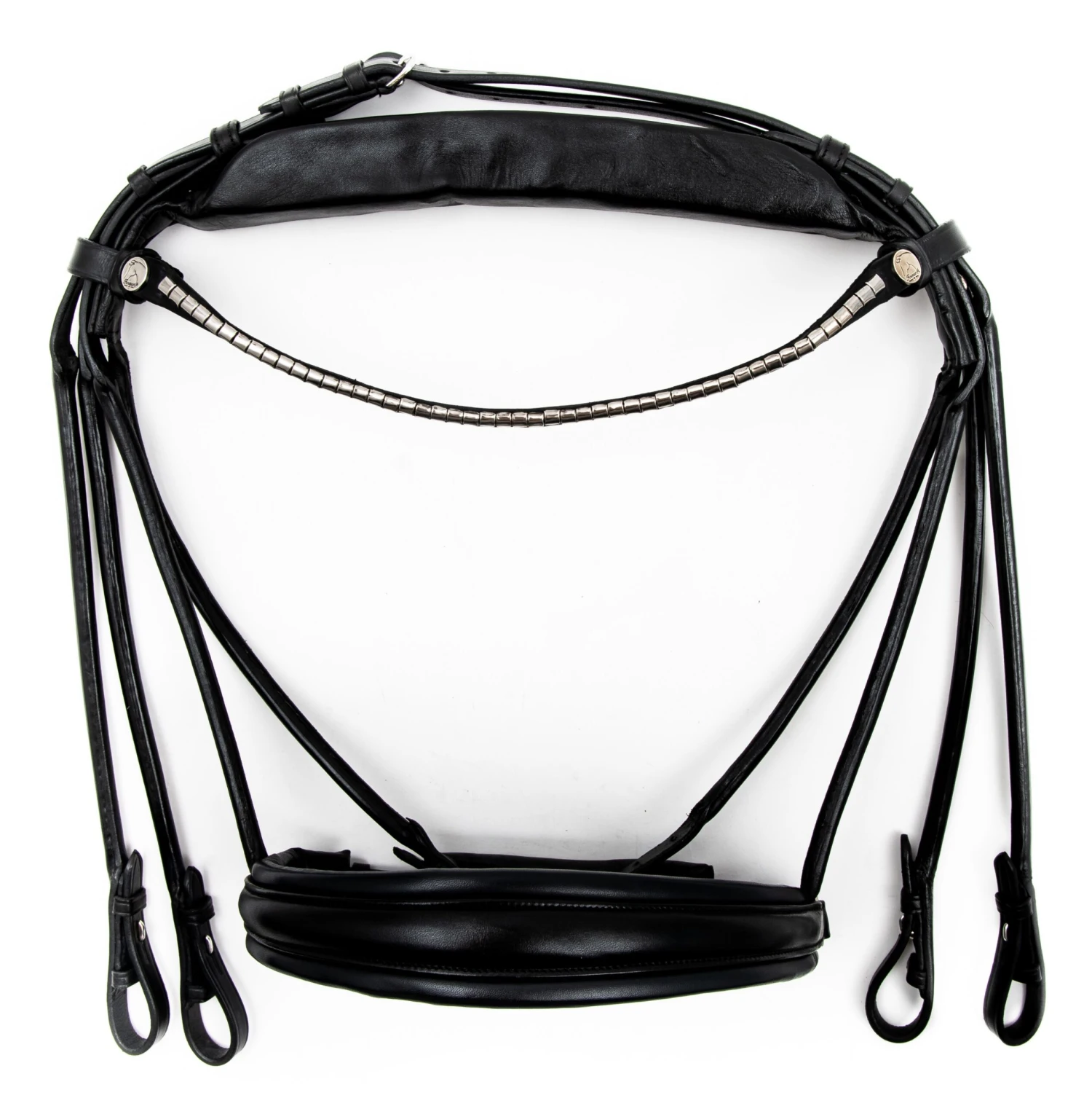 Ein anatomisch und rundgenähter Kandarenzaum mit einem einzigartigen Genickstück, das Druck- und Muskelschäden in den Hals- und Nackenmuskeln des Pferdes vorbeugt. Der Kandarenzaum ist mit einem dünnen Stirnband mit schicken silbernen Vierecken ausgestattet.