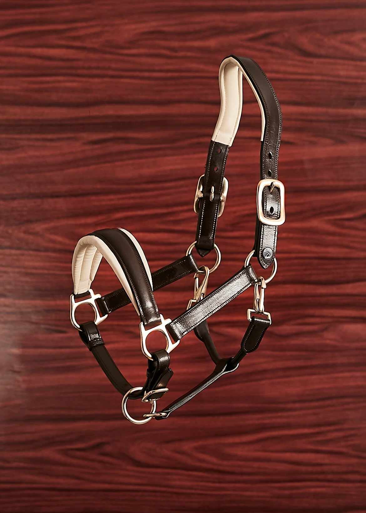 Sehr weiches und schönes Halfter von Finesse. Das Halfter ist aus braunem Leder mit beiger Polsterung und messingfarbenen Schnallen. Das Halfter von Finesse hat Schnallen auf beiden Seiten des Halfters und Sie können die Größe des Halfters auch unter dem Kinn anpassen.