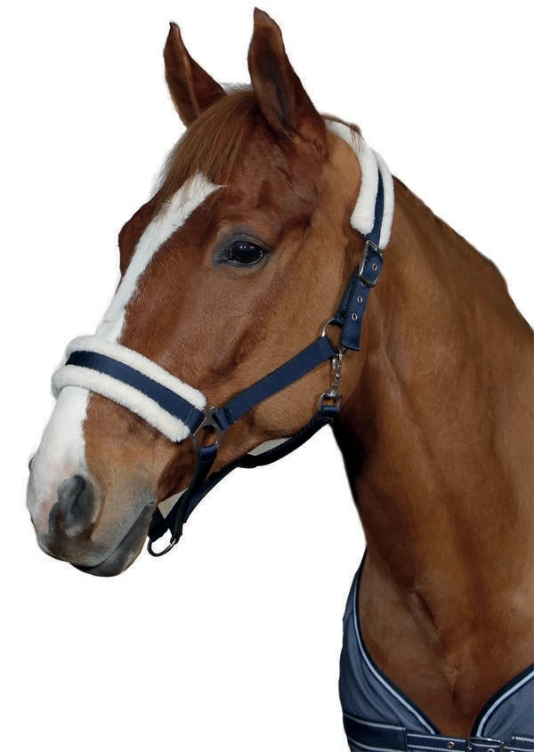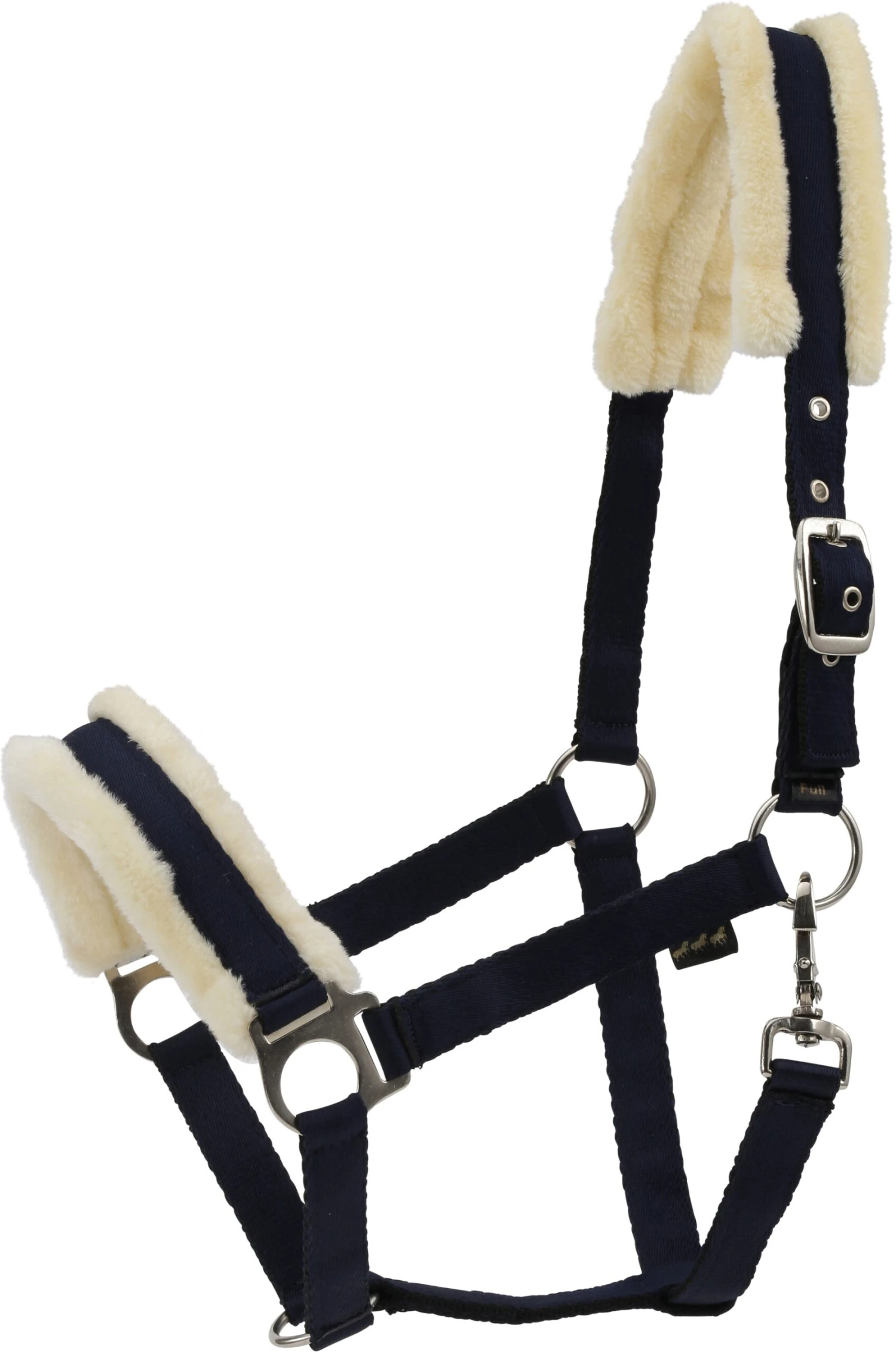 Soft ist ein Textilhalfter mit weicher Polsterung aus imitierter Lammwolle über Nase und Genick. Der Halfter besteht aus weichem Polypropylen, wodurch der Halfter nicht nur bequem ist, sondern auch zerreißen kann, wenn das Pferd irgendwo hängen bleibt. Leichte, vernickelte Beschläge und BGB-Karabinerhaken. Erhältlich in Marineblau oder Braun mit naturfarbener imitierter Lammwolle.