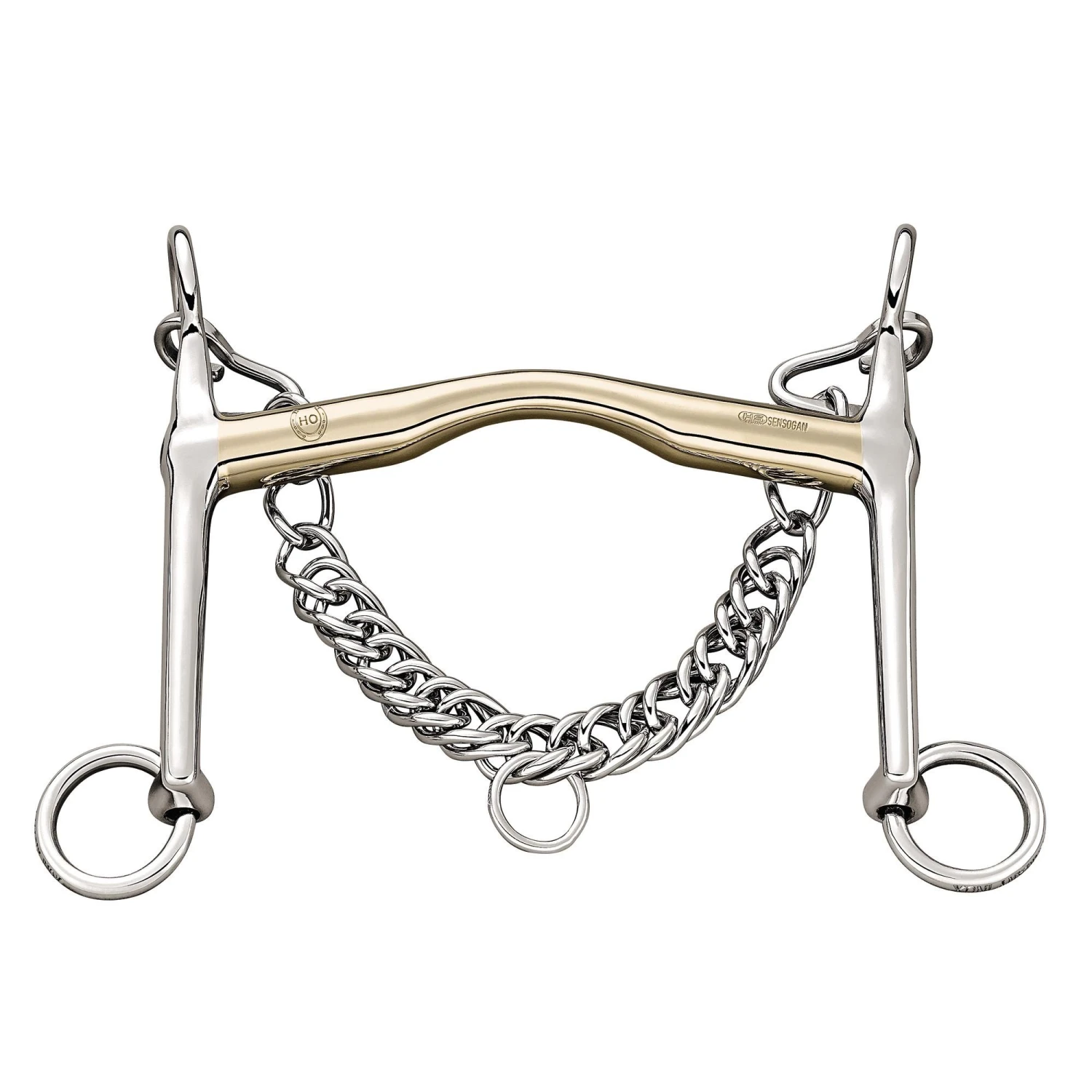 Sprengers HO-Kandare ist mit 5 oder 7 cm langen Anzügen erhältlich. Die kürzeren Anzüge geben einen etwas direkteren Kontakt und die längeren einen etwas schärferen. Sensogan ist Sprengers neuestes Material bestehend aus Kupfer, Mangan und Zink für reduzierte Oxidation und mehr Wohlbefinden beim Pferd.