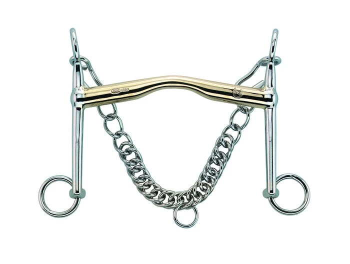 Sehr ausgewogenes Kandarengebiss mit Sensogan im Gebissteil und mit Edelstahl an den Seiten. Die Ringe, an denen die Kette befestigt werden soll, sind gut platziert, damit das Maul des Pferdes nicht eingeklemmt wird.