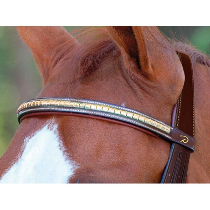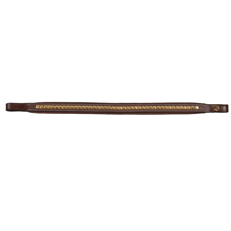 Schönes gerades Stirnband von Dyón in braunem Leder verziert mit messingfarbenem Klinker.