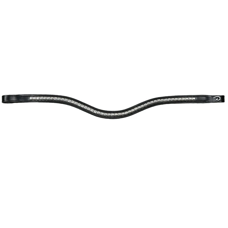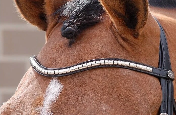 Das Stirnband von Dyón ist geschwungen mit Dyóns Logo in Silber auf einer Seite des Stirnbandes, darüberhinaus ist das Stirnband mit silbernem Klinker verziert. Klinkerstirnbänder sind klassisch und passen super zu allen Pferden.