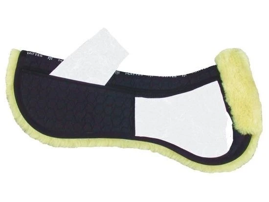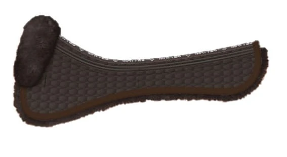 Korrektur Sattelpad ohne hinteren Rand von Mattes. Das Sattelpad besteht aus echtem Schaffell mit einem Kanal, der entlang der Wirbelsäule verläuft. Es hat Einsatztaschen an den Seiten, wo Sie die Füllung Ihrem Pferd anpassen können. Das Korrektur-Pad wird mit Vorteil bei Pferden angewendet, die vorne wenig Muskeln oder einen hohen Widerrist haben. Farbe Braun mit braunem Schaffell. Dieses Schaffell-Pad verfügt über ein sogenanntes PM-System mit Löchern zur Befestigung der Gurte der Schabracke. Es hat also keine eigenen Gurte. Das Sattelpad hat auch oben Löcher für das „Saddle Fix System“, wenn Sie das Sattelpad am Sattel befestigen möchten. Separat erhältlich.