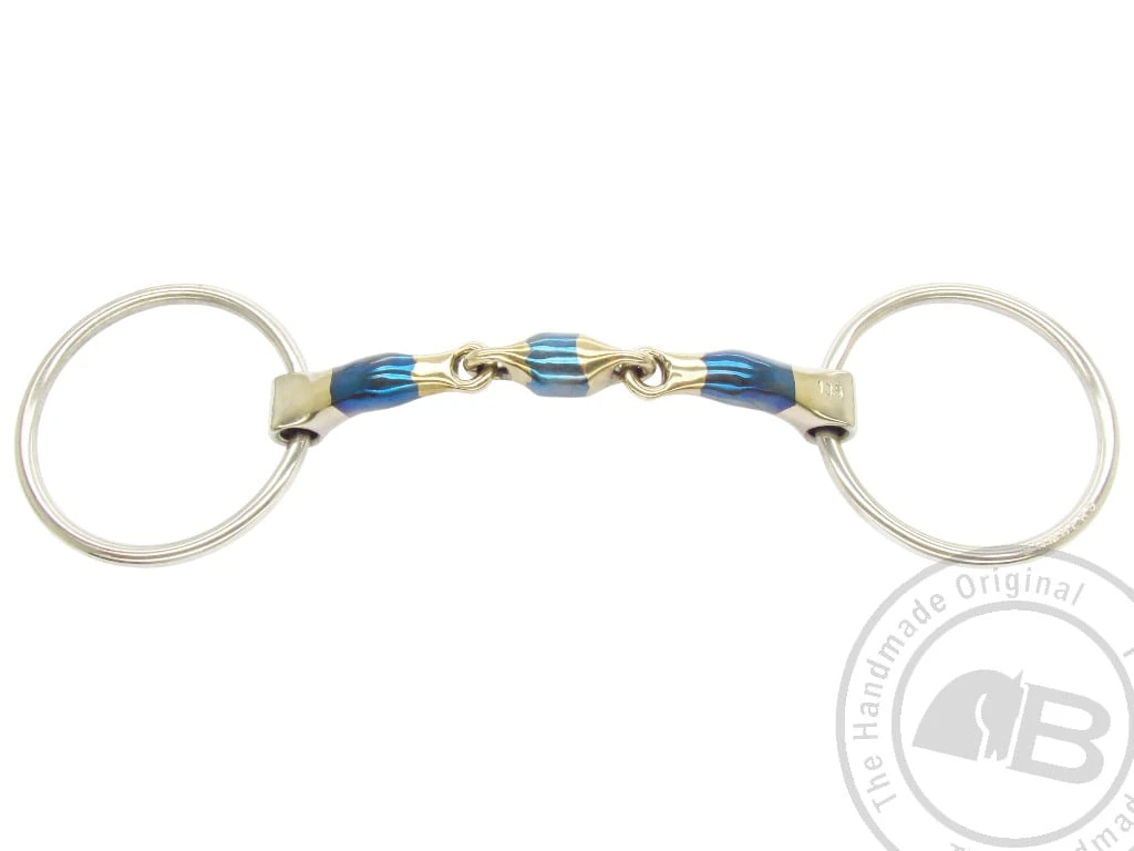 Genau wie die anderen Bomber-Gebisse besteht das Loose Ring Elliptical Gebiss aus süßem Eisen und Messing, was den Speichelfluss beim Pferd erhöht. Bombers Loose Ring Elliptical Wassertrense ist anatomisch geformt, was bedeutet, dass das Gebiss eine gute Position im Pferdemaul erhält und gleichzeitig der Druck auf die Zunge reduziert wird, da das Gebiss den Druck auf eine größere Fläche verteilt.