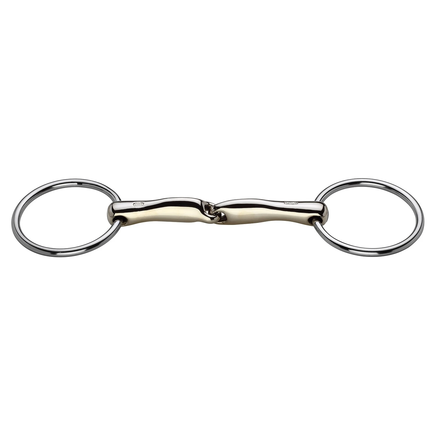Die Form im Maul des Pferdes ist nach wie vor anatomisch, aber die Gebisspartien haben jetzt eine ovalere Form. Die Übergänge zwischen den beiden Gebissteilen wurden noch weicher gemacht, damit alle Teile zusammen eine bessere Wirkung haben. Dieses Trensengebiss von Sprenger ist dicker und hat eine anpassbare Form, die sich darauf einstellt, wie hart oder weich Sie die Zügel benutzen.