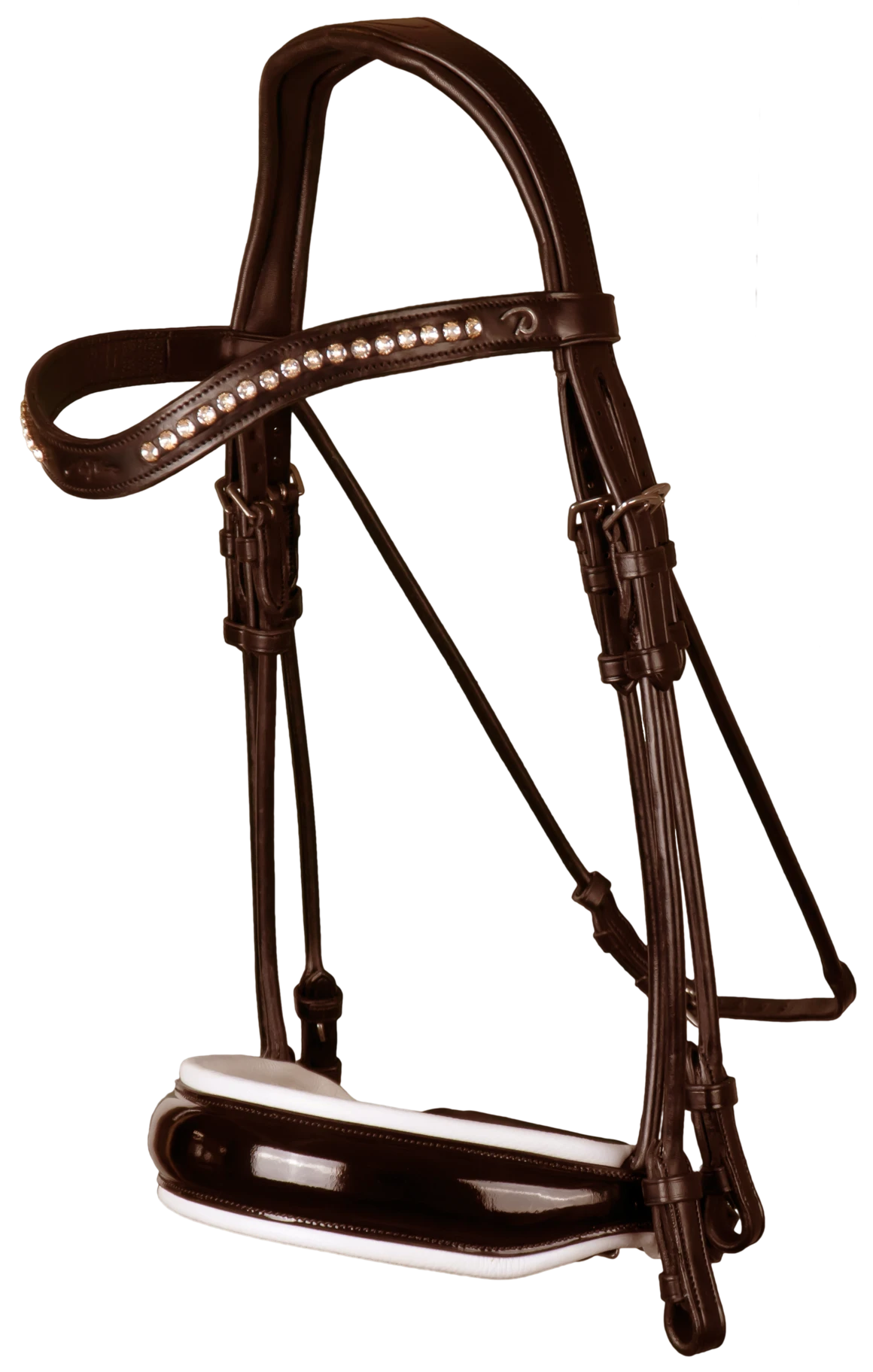 Die Funktionen dieser schönen, anatomischen Dyón-Kandare sind vielfältig. Der Nasenriemen ist ergonomisch, extra breit mit dünner werdenden, gebogenen Seiten, um das Risiko von Quetschverletzungen zwischen Gebiss und Nasenriemen zu verringern. Nasenriemen wird mit einem Pullback geschlossen. Das Genickstück der Kandare ist anatomisch gestaltet und bietet ausreichend Platz für die Ohren. Die Backenstücke werden an den Seiten festgemacht, um den Druck auf das Genick zu verringern. Das Genickstück ist außerdem mit Neopren gepolstert und mit weichem Lammfell (ohne Fell) gefüttert. Standardmäßig wird diese Kandare mit einem Stirnband mit Strasssteinen geliefert. Zügel sind nicht enthalten.