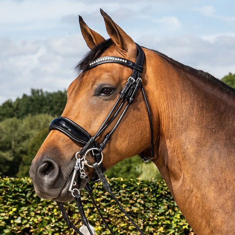 Das Genickstück der Kandare ist anatomisch gestaltet und bietet ausreichend Platz für die Ohren. Die Backenstücke werden an den Seiten festgemacht, um den Druck zu verringern. Das Genickstück dieser Kandare ist außerdem mit Neopren gepolstert und mit weichem Lammfell (ohne Fell) gefüttert. Die rundgenähten Kandaren der Dyón Dressage Collection werden mit Stirnbändern mit Strasssteinen geliefert.