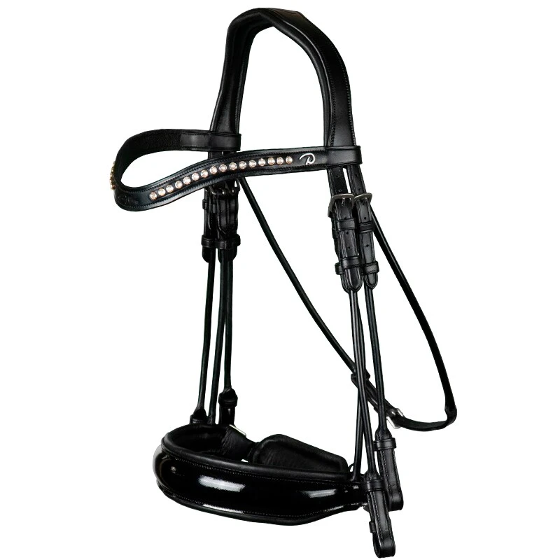 Diese Kandare ist in Schwarz oder Braun mit einem Nasenriemen mit weißem Futter oder Ton in Ton, mit oder ohne Lack erhältlich.