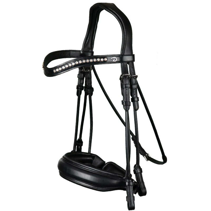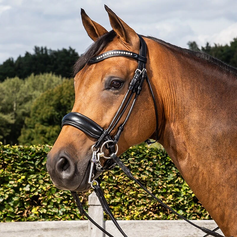 Das Genickstück der Kandare ist anatomisch gestaltet und bietet ausreichend Platz für die Ohren. Die Backenstücke werden an den Seiten festgemacht, um den Druck zu verringern. Das Genickstück dieser Kandare ist außerdem mit Neopren gepolstert und mit weichem Lammfell (ohne Fell) gefüttert. Die rundgenähten Kandaren der Dyón Dressage Collection werden mit Stirnbändern mit Strasssteinen geliefert.