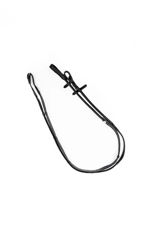 Diese Zügel von Finesse haben Stopper und ein Cover aus dünnem Kalbsleder, wodurch sie angenehm zu benutzen sind. Diese Zügel sind schwarz mit silbernen Schnallen.