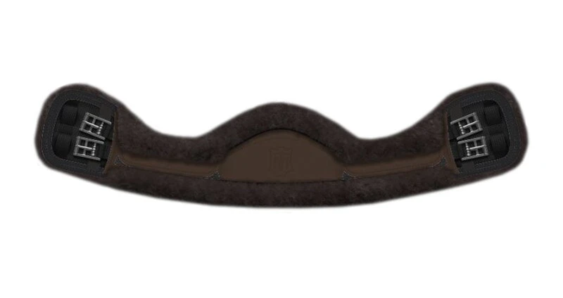 Sattelgurt Slim-Line Crescent von EA Mattes mit Schaffell. Slim-Line Crescent ist für Pferde geeignet, die einen kurzen Rücken haben gleichzeitig etwas praller sind. Dies führt häufig dazu, dass der Sattel und der Sattelgurt im Ellbogen nach vorne rutschen. Die Form dieses Sattelgurts mit Schaffell verhindert, dass der Sattel nach vorne geschoben wird, und lässt Platz für die Ellbogen, so dass sich das Pferd frei bewegen kann. Der Sattelgurt ist braun mit braunem Schaffell.
