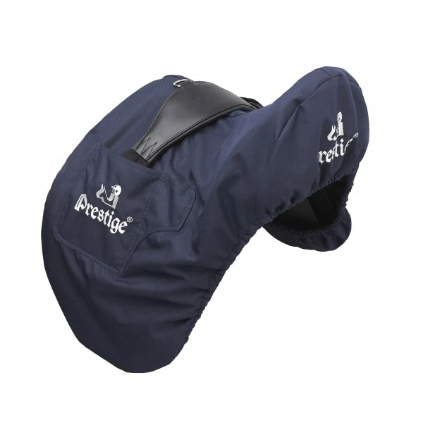 Dieser Sattelschonbezug besteht aus dicker, mit Fleece gefütterter Baumwolle und hat Taschen an den Seiten, an denen der Sattelgurt an Ort und Stelle gehalten werden kann. Erhältlich in Marine mit dem Prestige-Logo.