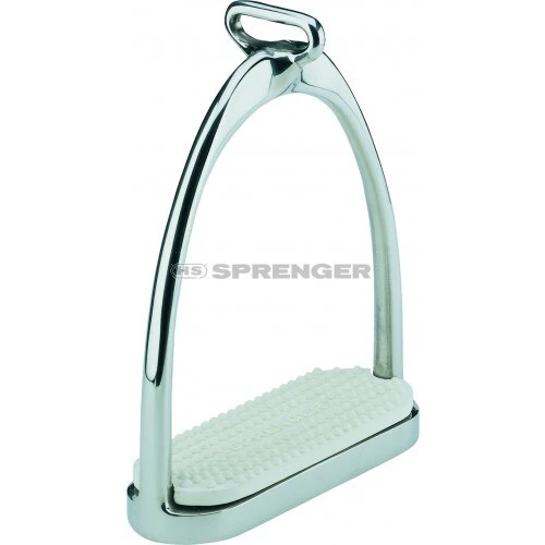 Dessa OFFSET „EYE“ Steigbügel von Herm. Der Sprenger hat eine feste Querschlaufe für den Steigbügel, was bedeutet, dass der Steigbügel immer „gerade nach unten“ in der richtigen Position für das Bein hängt. Polierter Edelstahl, inklusive Gummiplatte, Einheitsgröße: Innere Fußstütze 12 cm, Innenhöhe 12,5 cm.