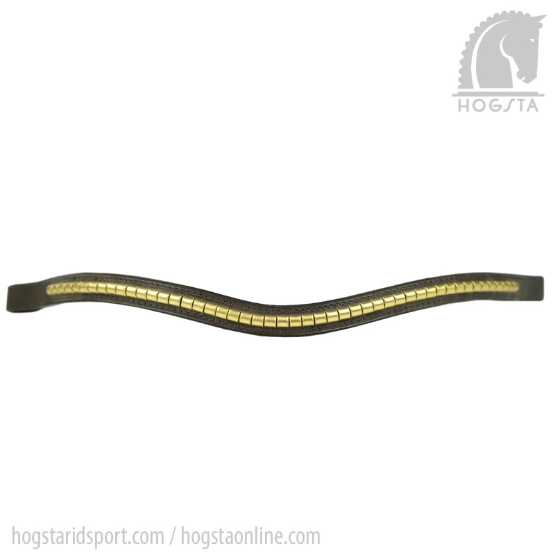 Bogenförmiges Stirnband von Otto Schumacher. Das Stirnband besteht aus braunem Leder mit schönen Messingklinkern. Das Klinker-Stirnband ist sowohl für glatte als auch für rund genähte Trensenzäume erhältlich. Größe Full