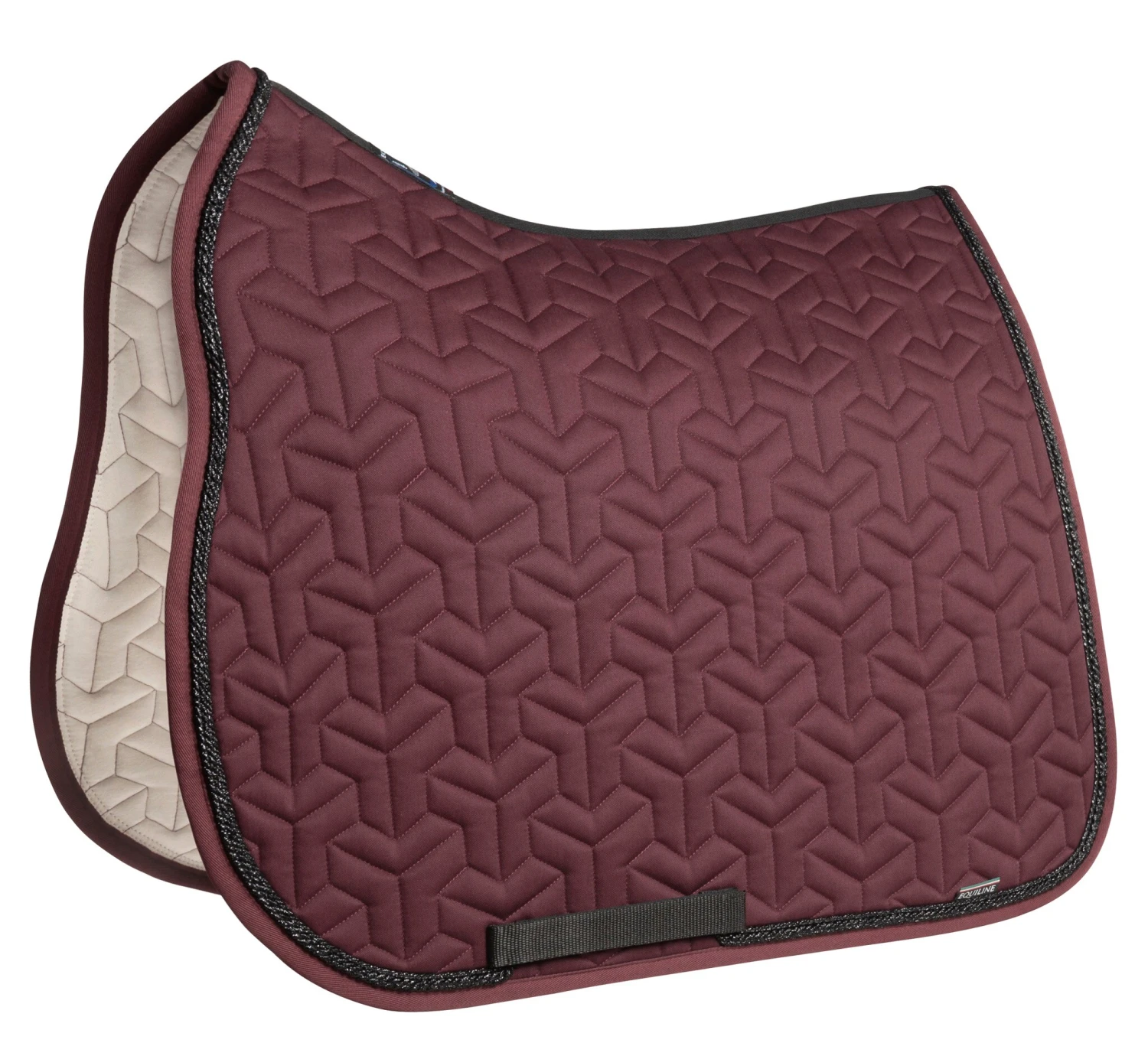 Die Dressurschabracke Tetrix hat ein richtig schönes Design mit Steppung im Tetrix-Muster. Die Schabracke ist in einer schönen dunkelroten Farbe mit drei Zierkordeln in schwarzem Glitzer.