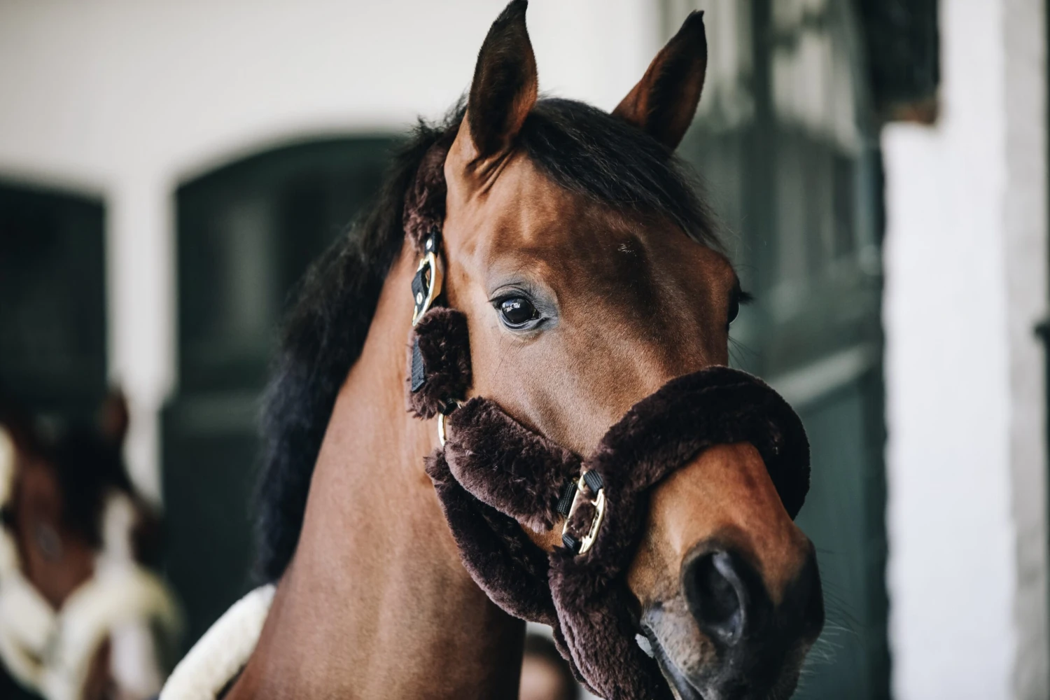 Brauner, ganz mit künstlichem Schaffell bedecktes Textilhafter von Kentucky. Es ist ein Halfter, der nicht nur wunderschön und weich ist, sondern auch aus einem Material besteht, das sich gut für den Transport von Pferden eignet, weil es nicht kaputtgehen kann. Dank des Fells ist das Risiko, dass der Halfter scheuert, so gut wie Null. Der mit „Schaffell“ bedeckte Sheepskin Shipping Halter von Kentucky, ist ein Transporthalfter, der wirklich aus der Reihe fällt, und den jeder sich für das Pferd, das er pflegt, wünscht. Auf Lager in Braun, FS