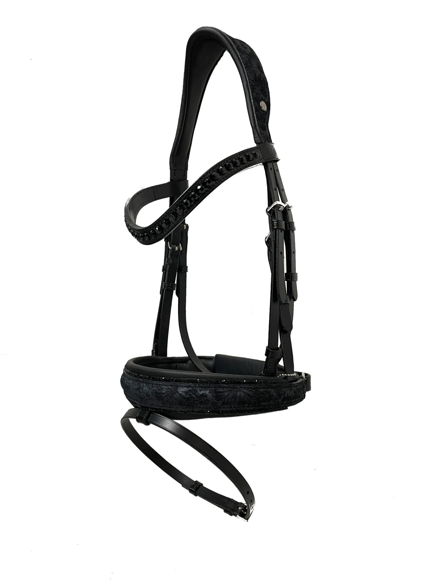 Sowohl das Genickstück als auch der Nasenriemen sind außen mit dem dekorativen Magarete-Leder versehen und der Nasenriemen hat zusätzlich eine Fineline-Paspelierung in schwarz funkelndem Swarovski-Crush.