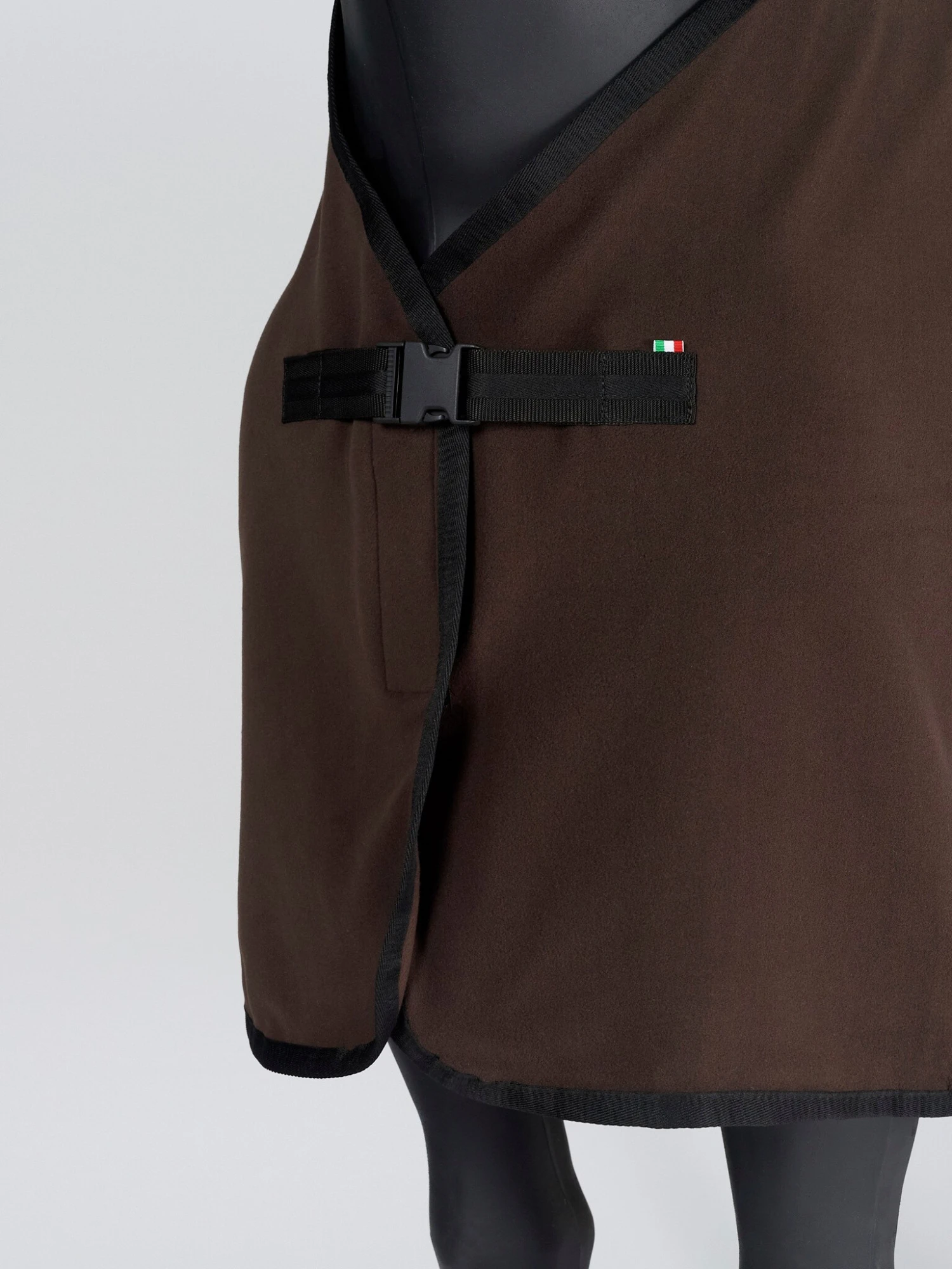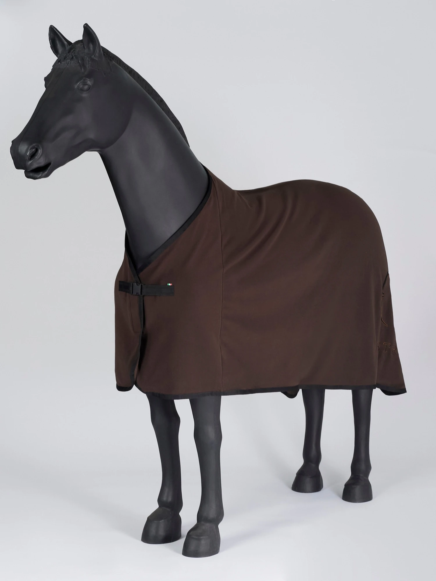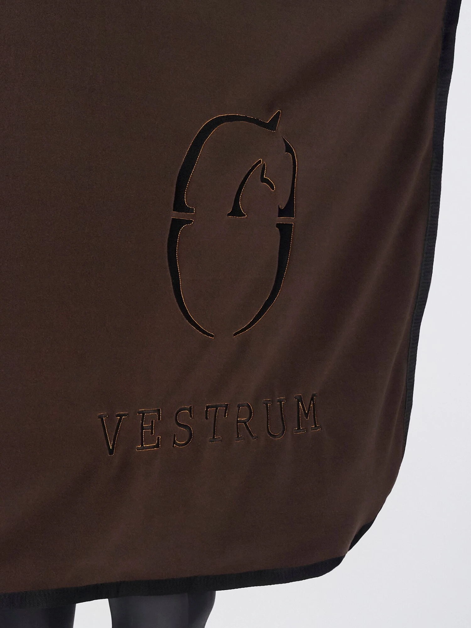 Die Fleecedecke von Vestrum ist braun mit schönen Details wie dem Vestrum-Logo und Text auf der linken Seite der Pferdedecke.